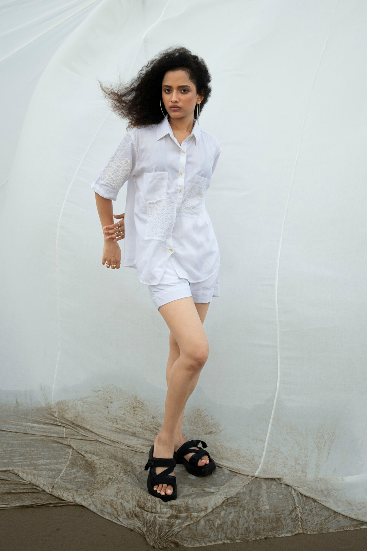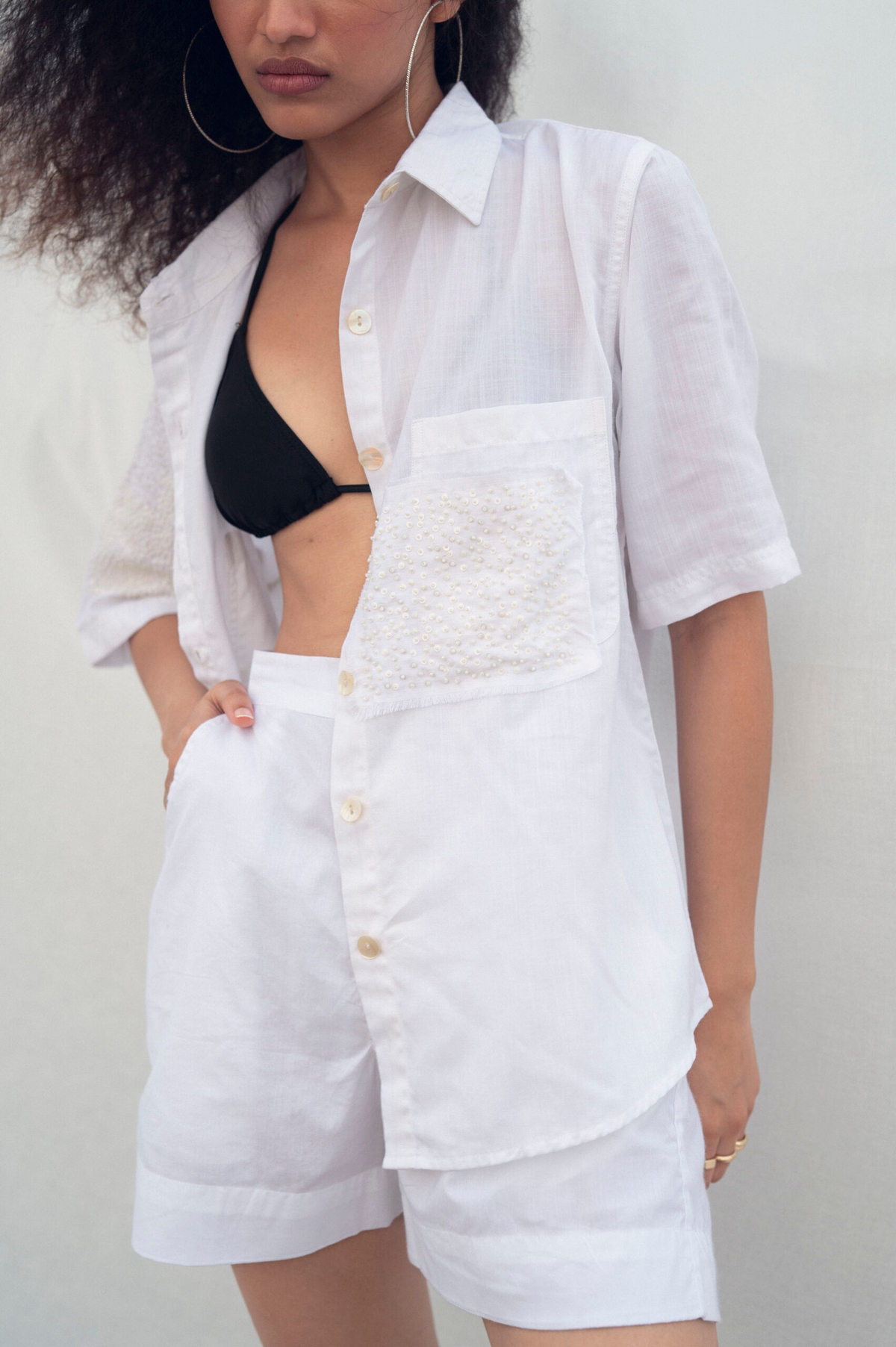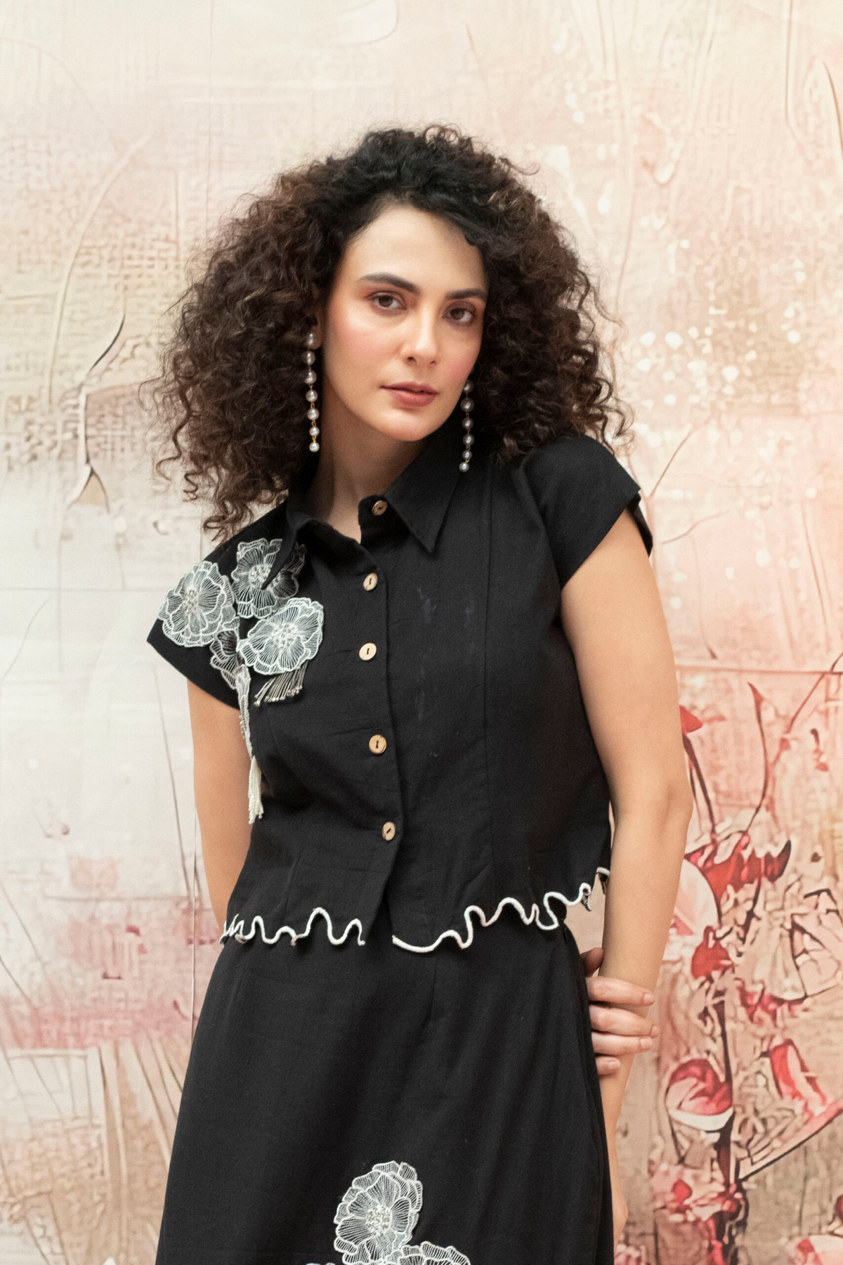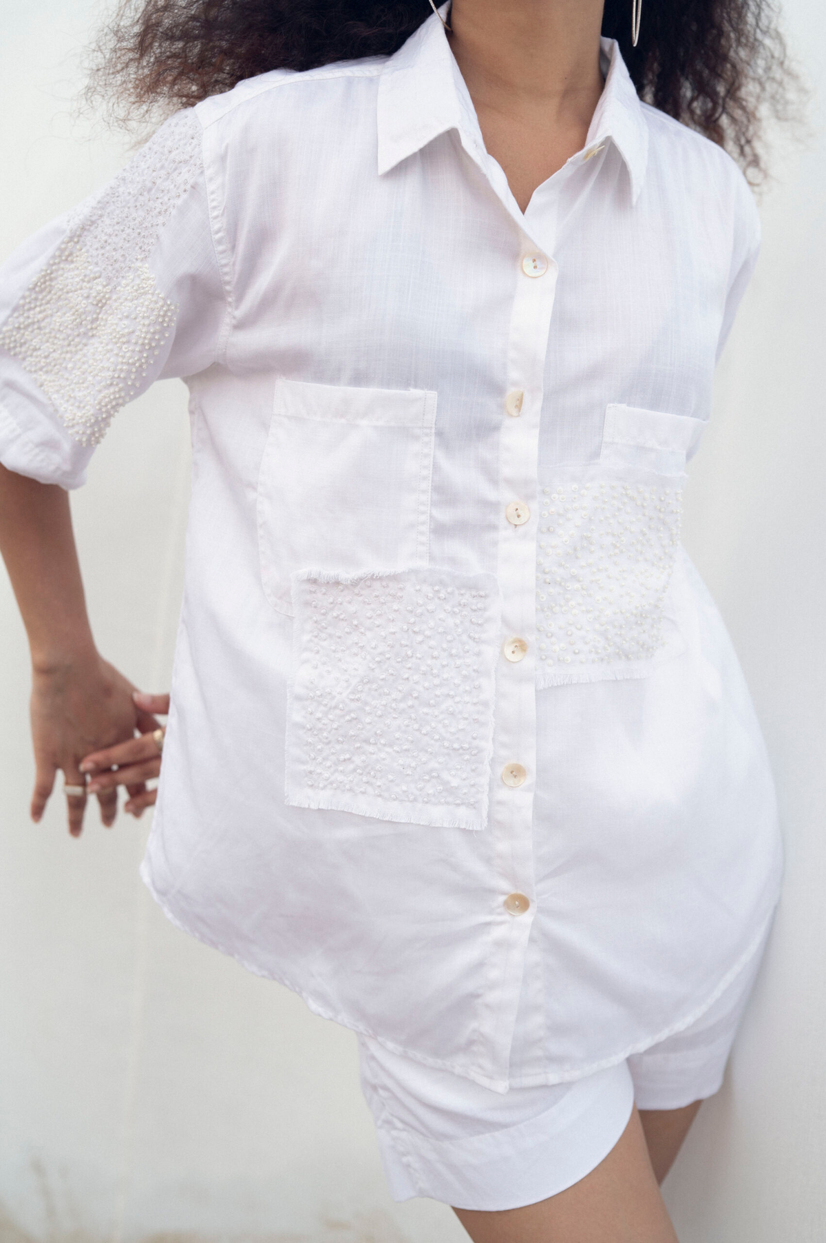 This structured shirt features a relaxed, easy fit that sits comfortably on the body while maintaining a tailored silhouette. It includes short sleeves with clean edging and a classic collar for a polished finish. The front yoke is enhanced with delicate pintuck detailing, adding subtle texture and dimension. Intricate floral embroidery on one side brings a handcrafted charm, complemented by a single curved patch pocket outlined with fine threadwork. Button closure at the front completes the look with understated elegance.