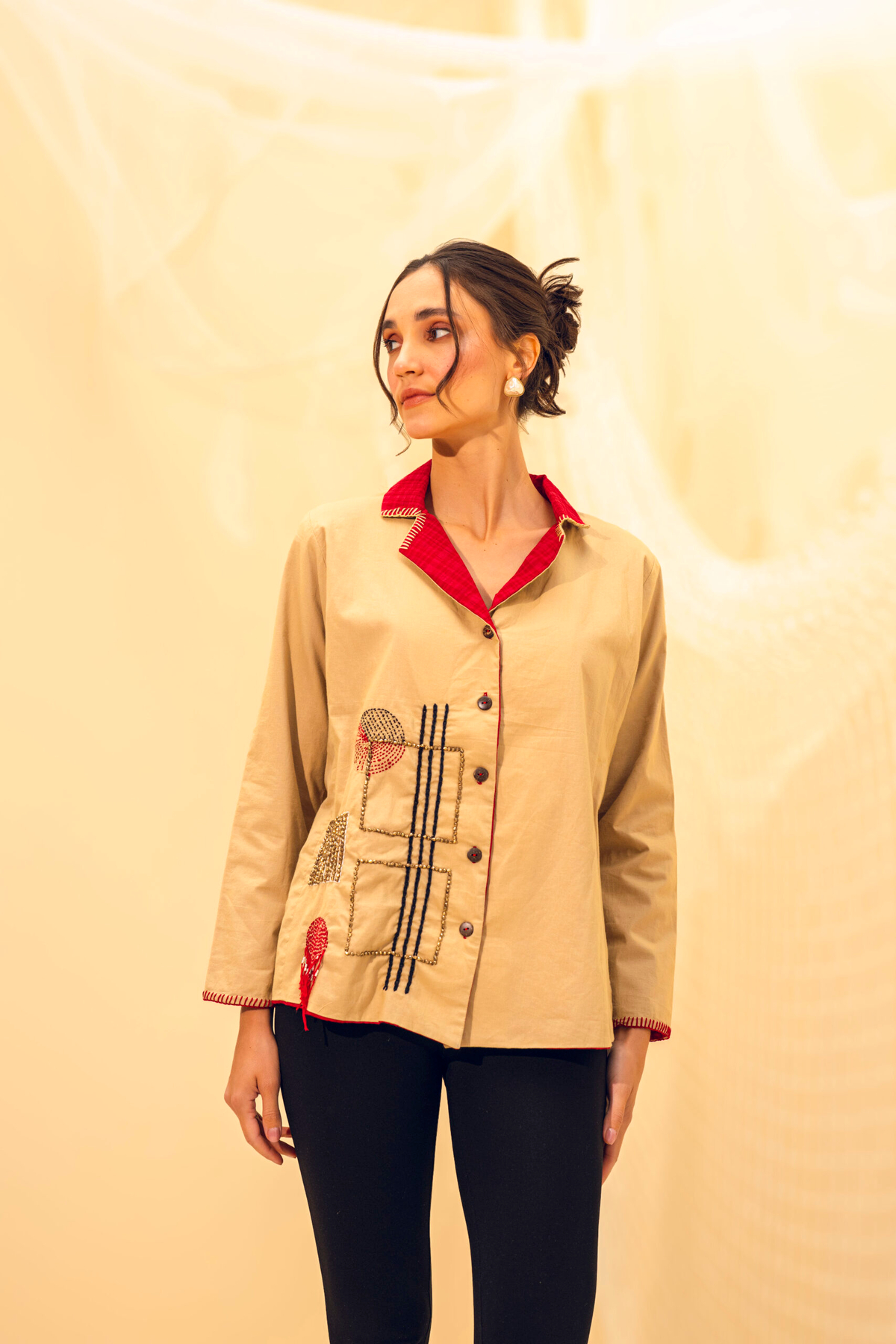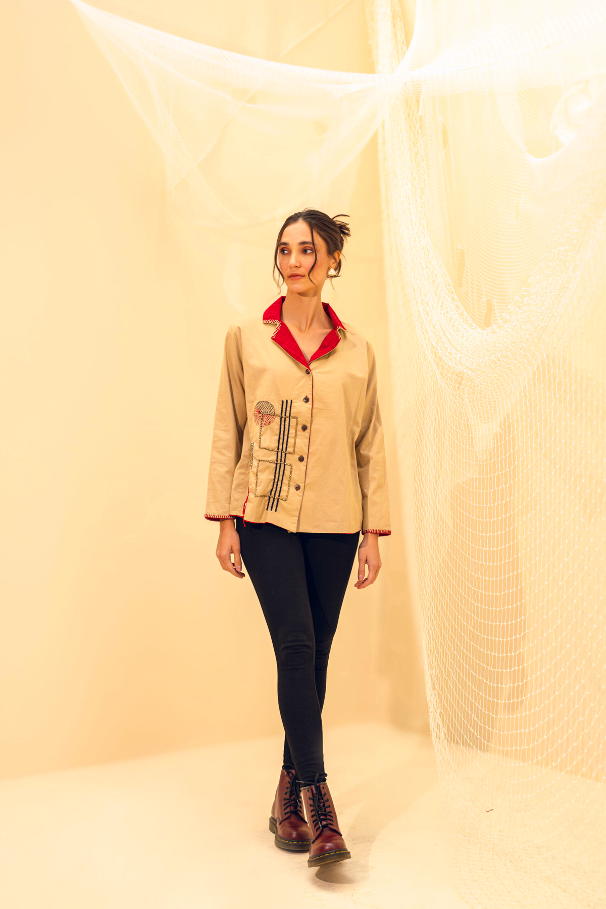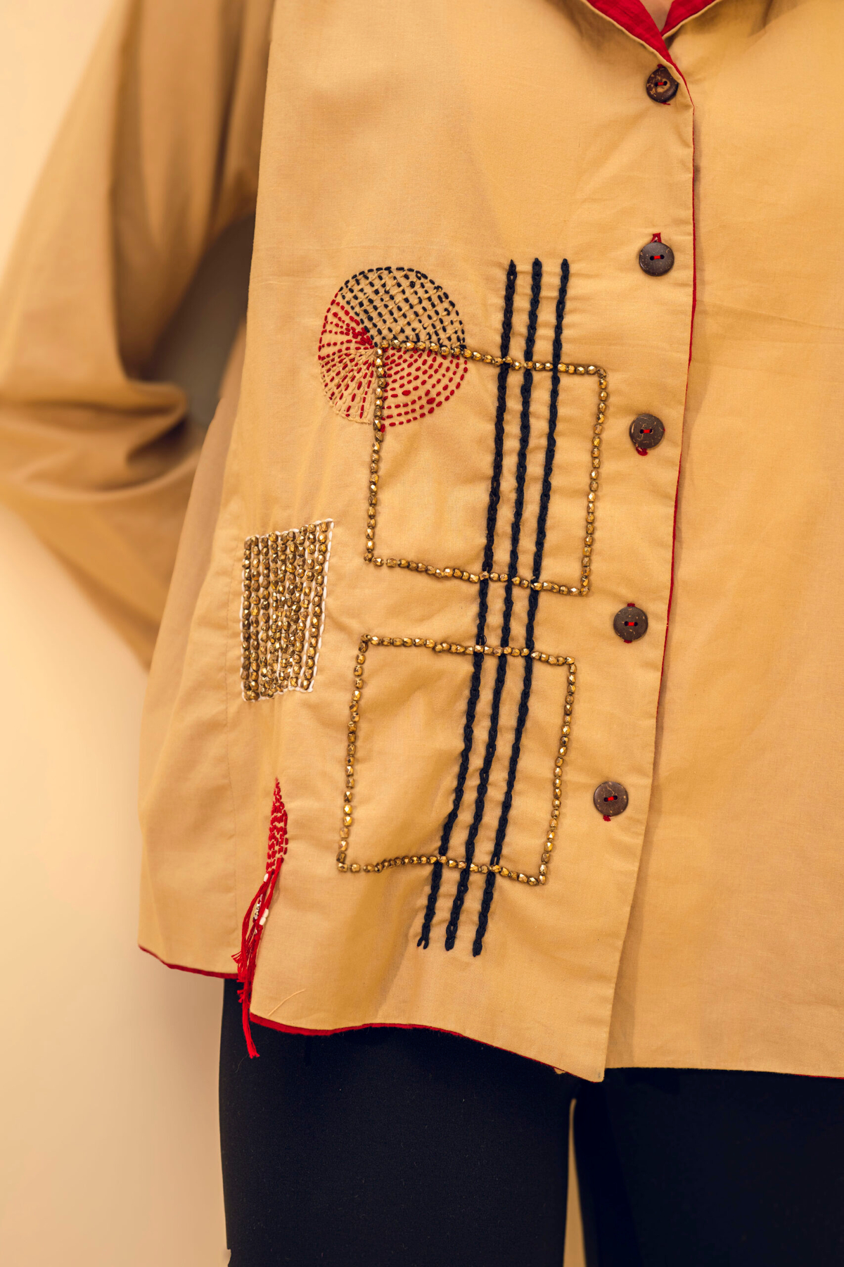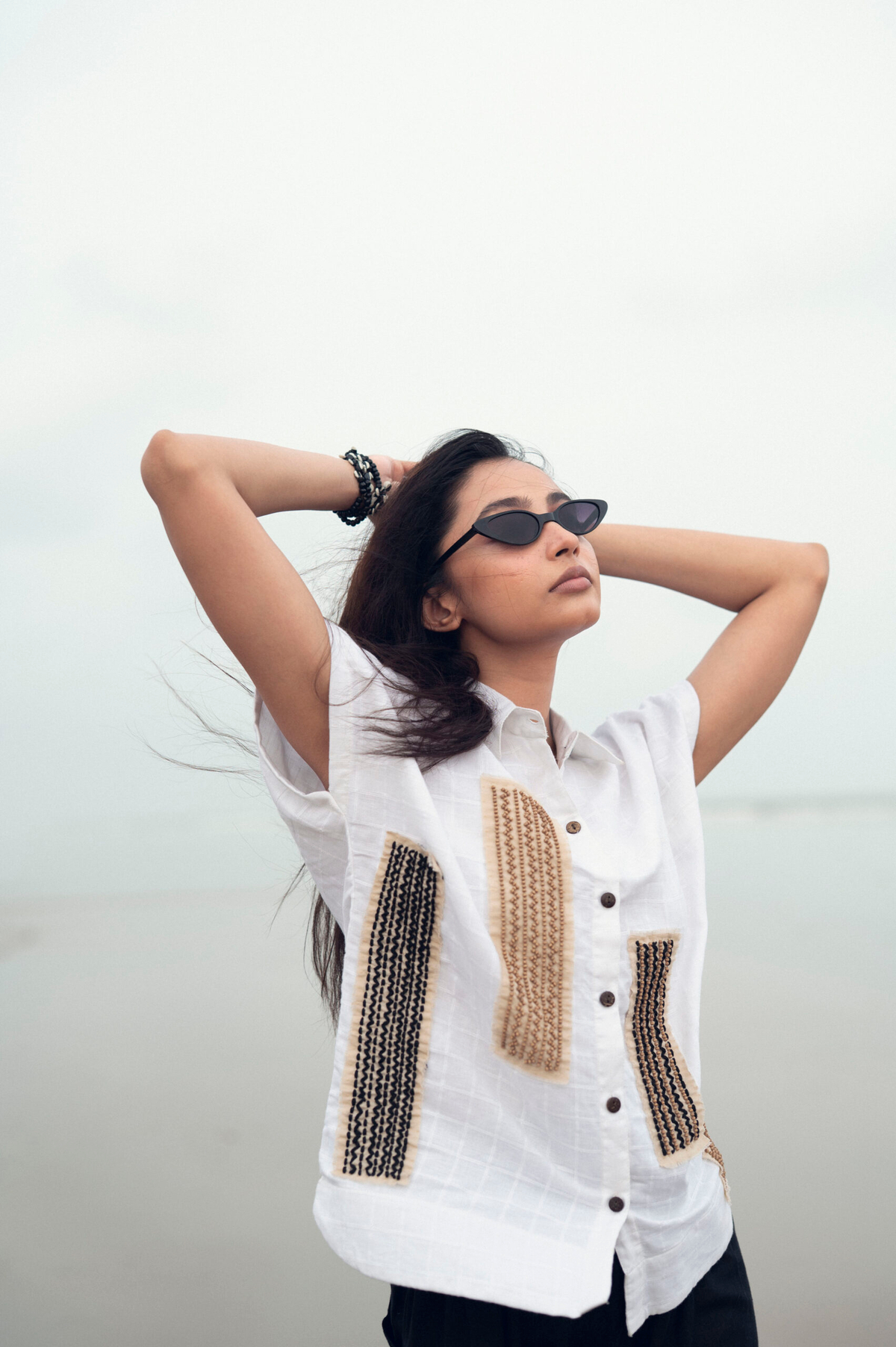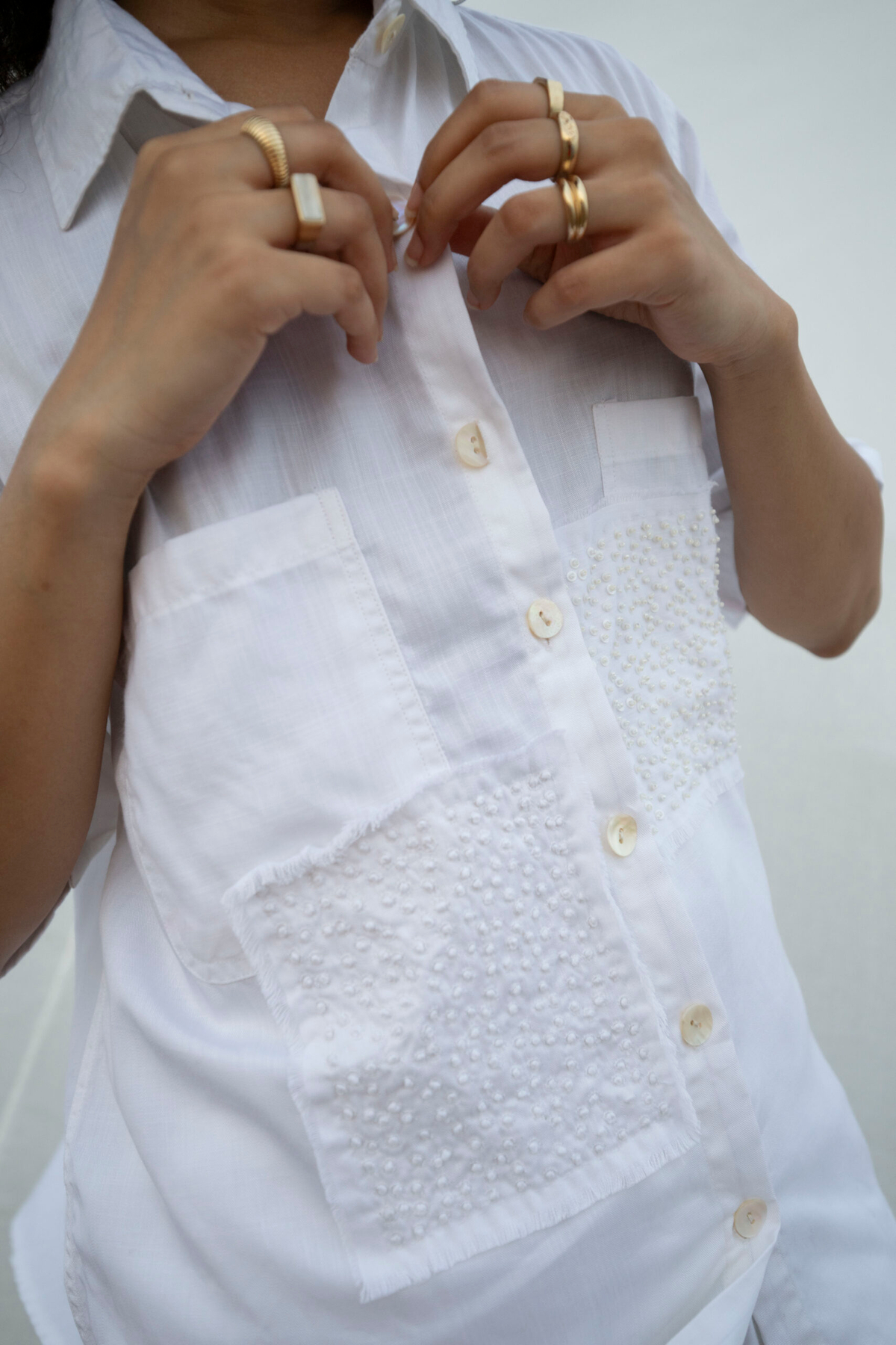 This structured shirt features a relaxed, easy fit that sits comfortably on the body while maintaining a tailored silhouette. It includes short sleeves with clean edging and a classic collar for a polished finish. The front yoke is enhanced with delicate pintuck detailing, adding subtle texture and dimension. Intricate floral embroidery on one side brings a handcrafted charm, complemented by a single curved patch pocket outlined with fine threadwork. Button closure at the front completes the look with understated elegance.