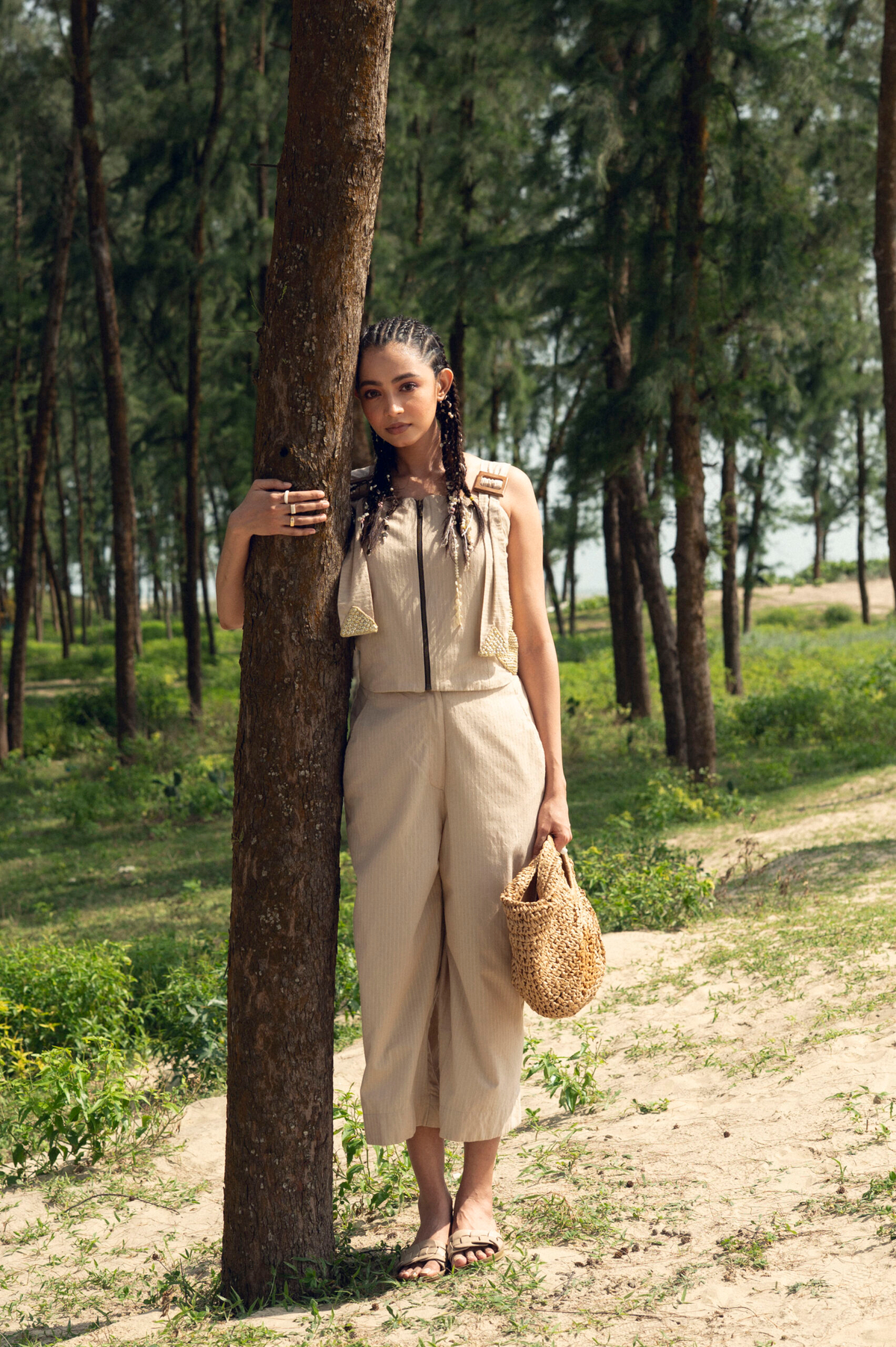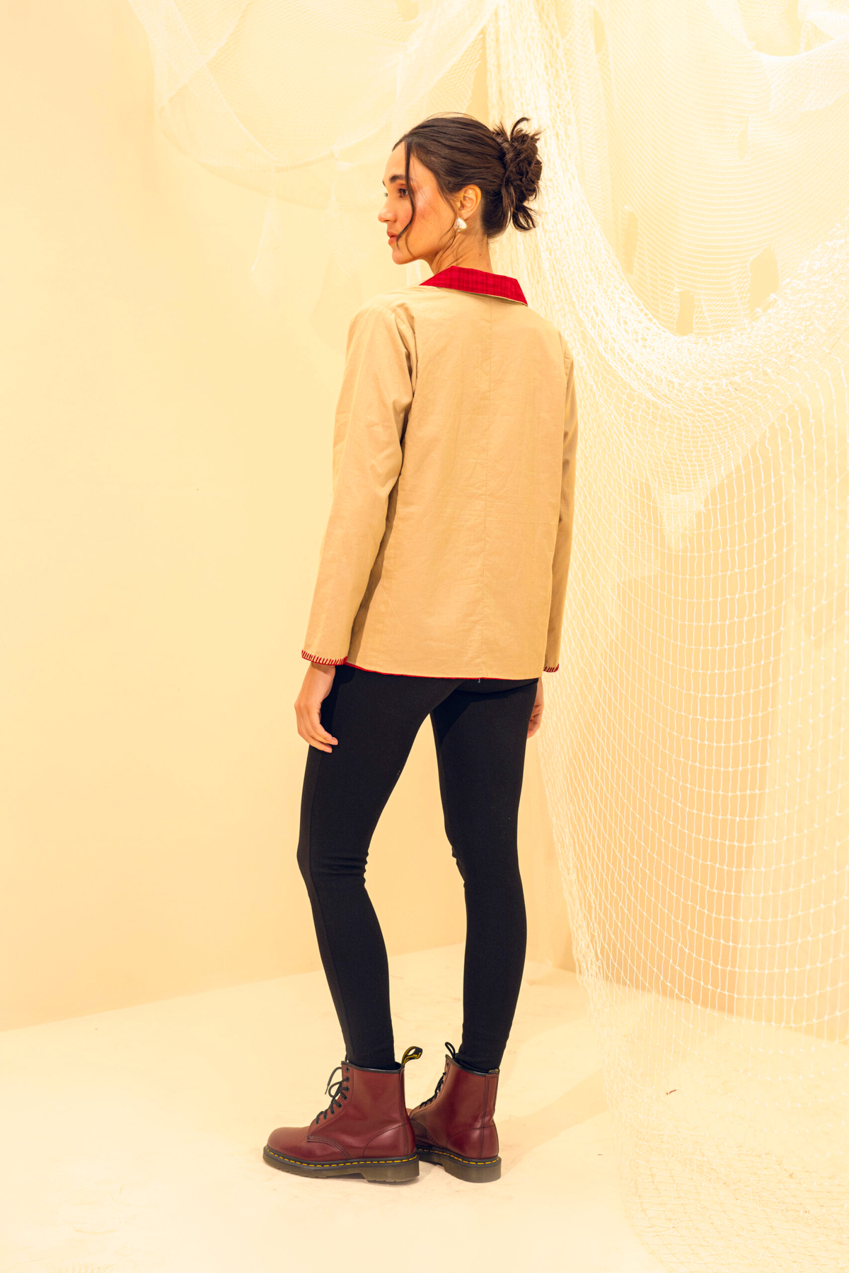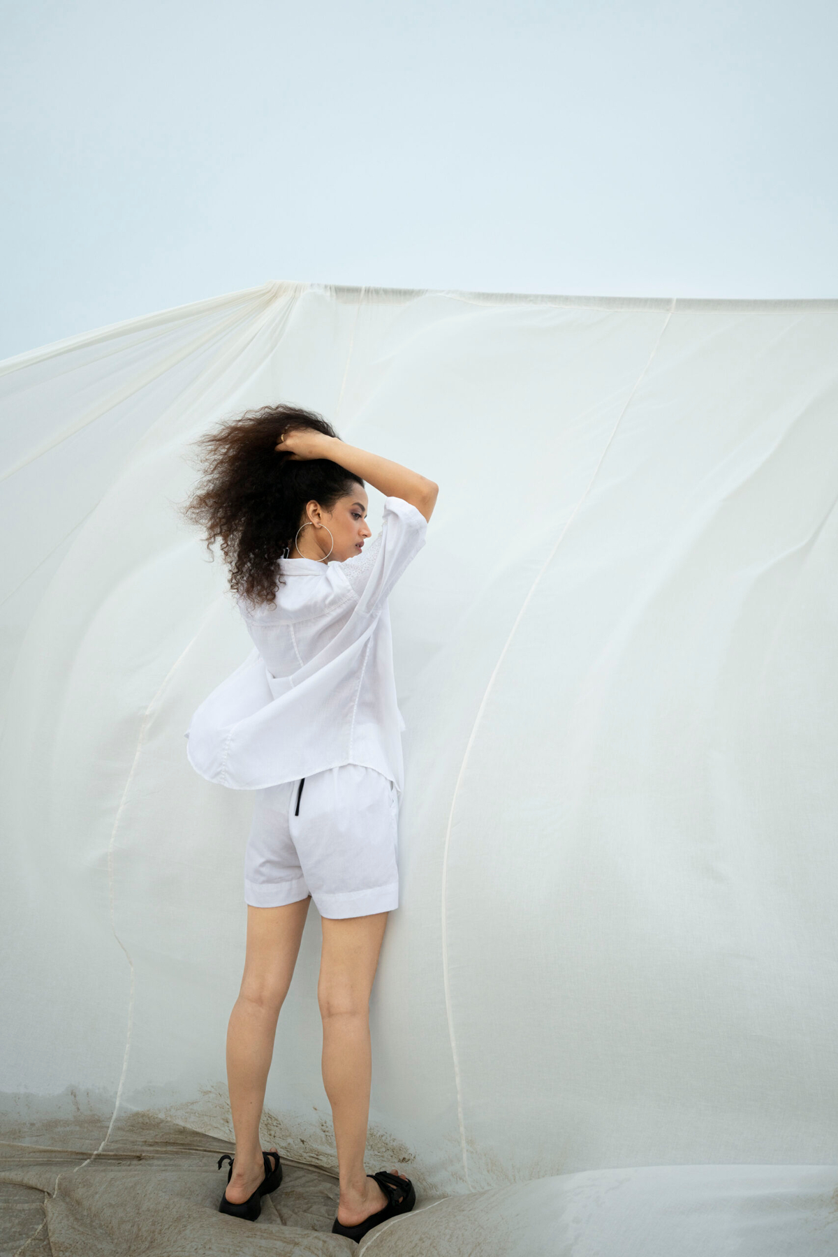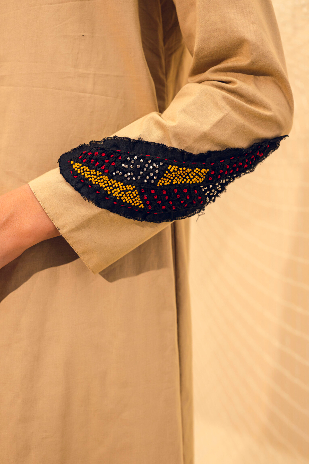 This structured shirt features a relaxed, easy fit that sits comfortably on the body while maintaining a tailored silhouette. It includes short sleeves with clean edging and a classic collar for a polished finish. The front yoke is enhanced with delicate pintuck detailing, adding subtle texture and dimension. Intricate floral embroidery on one side brings a handcrafted charm, complemented by a single curved patch pocket outlined with fine threadwork. Button closure at the front completes the look with understated elegance.