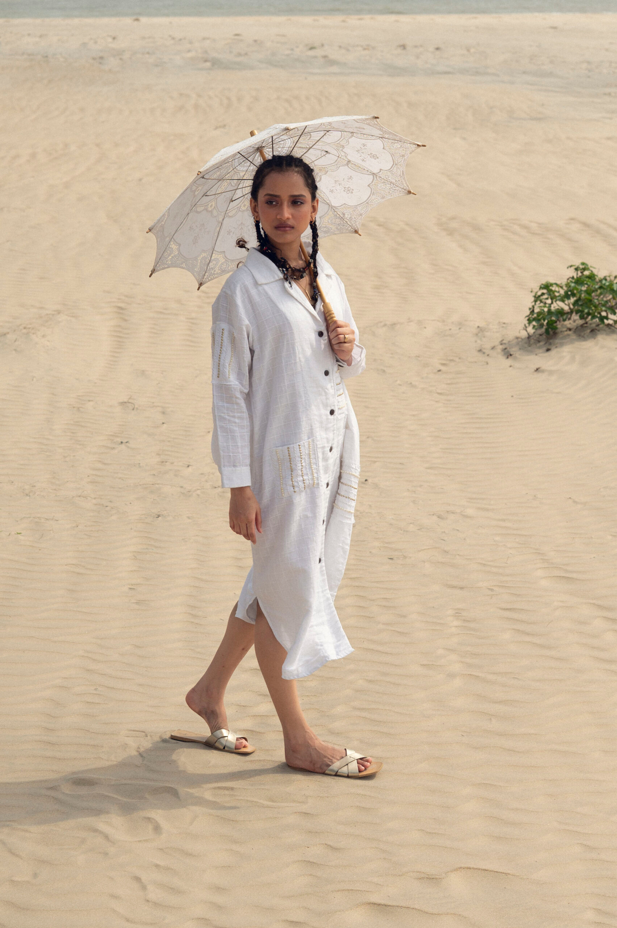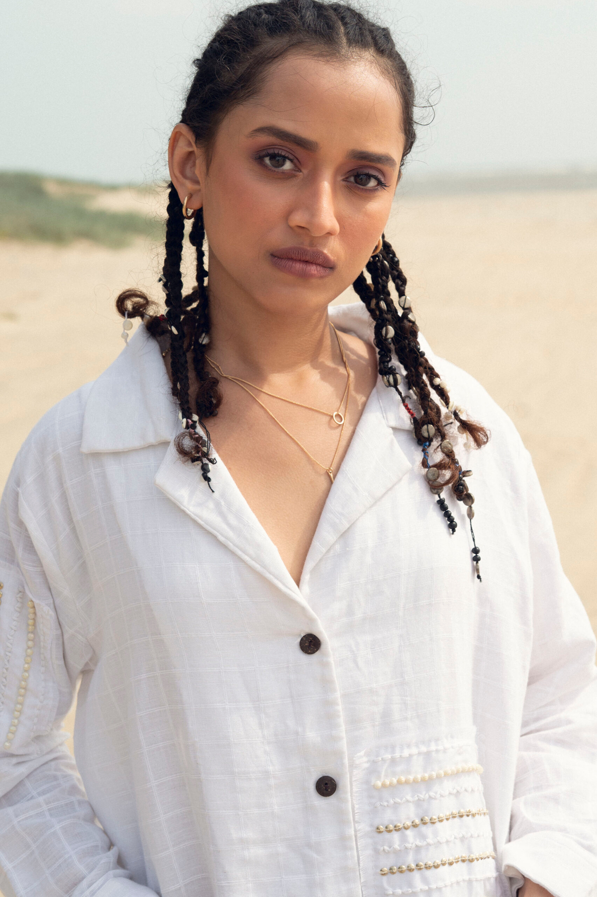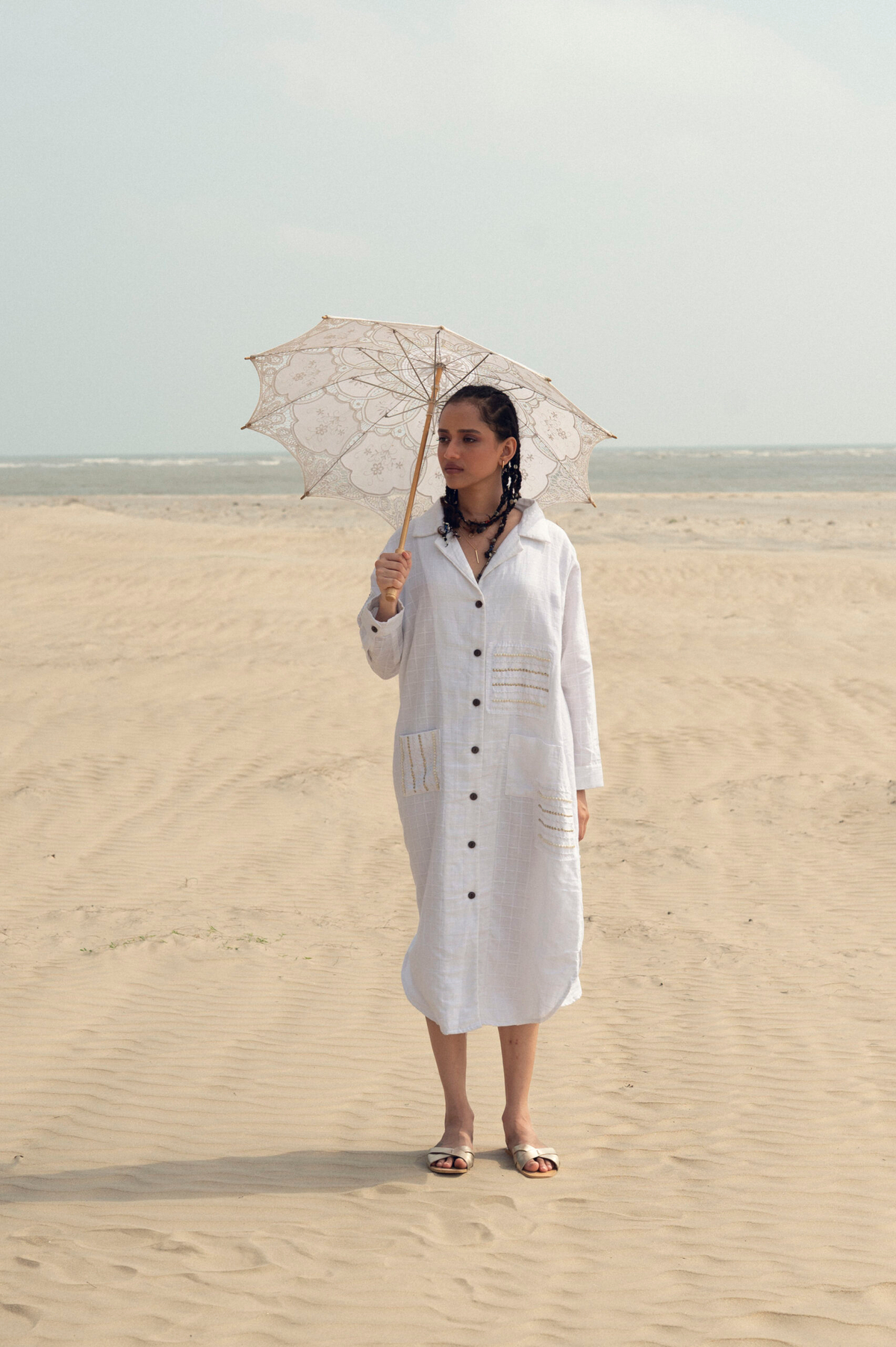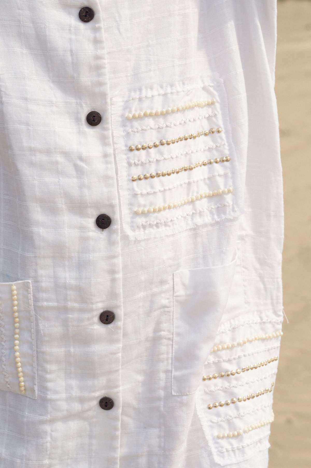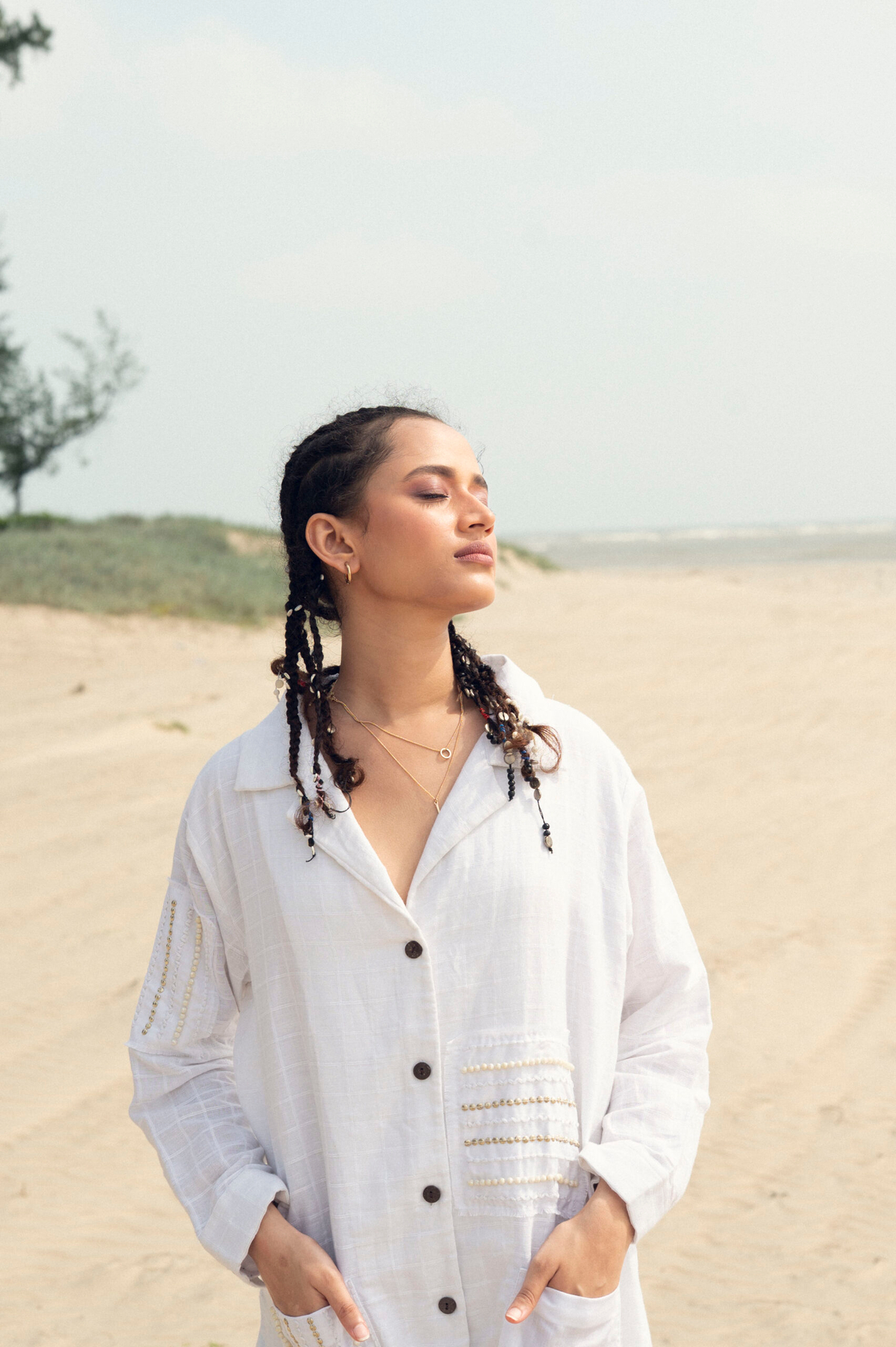 This breezy black co-ord set features a sleeveless, boxy-fit top with hand-detailed fringe pockets and raw edge accents, paired with an A- line skirt highlighted by a contrasting center seam. Effortlessly relaxed with an artisanal touch.