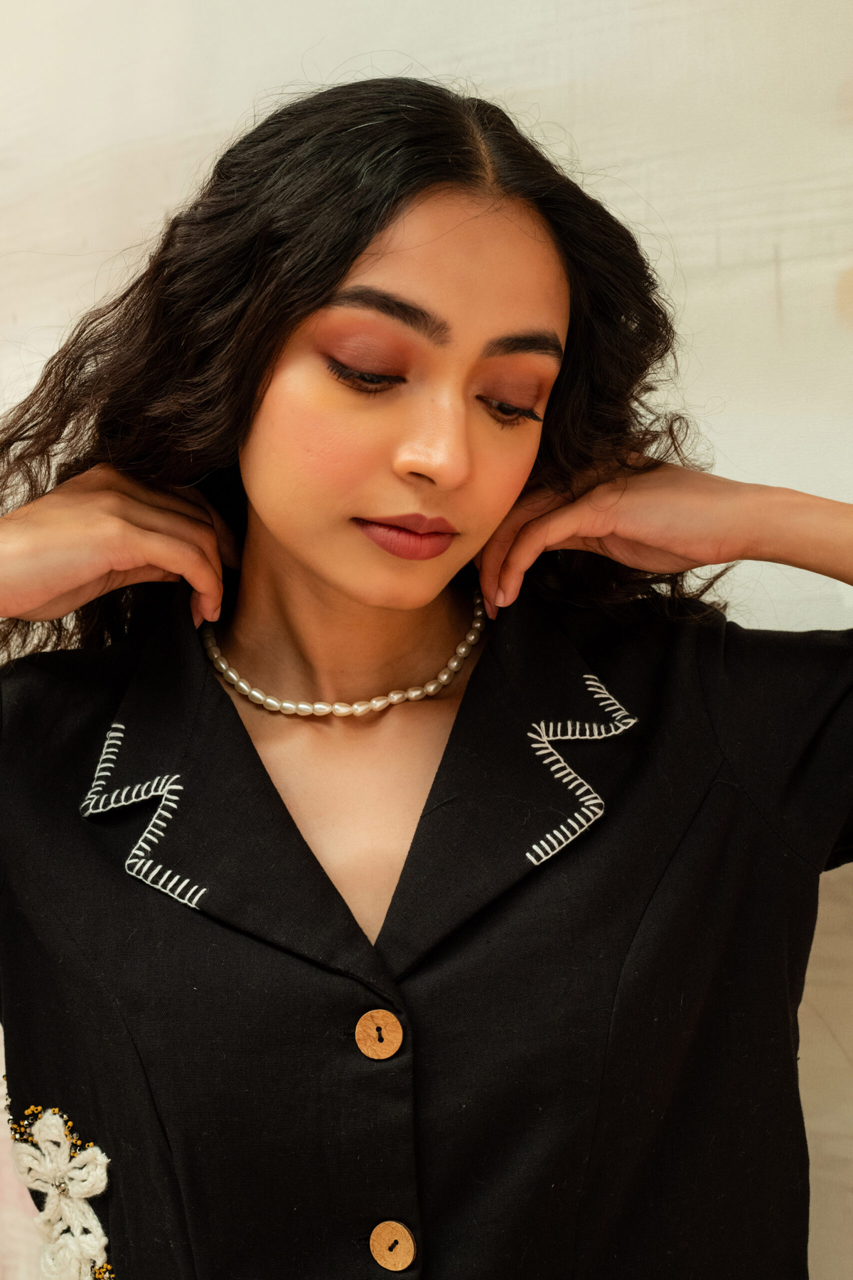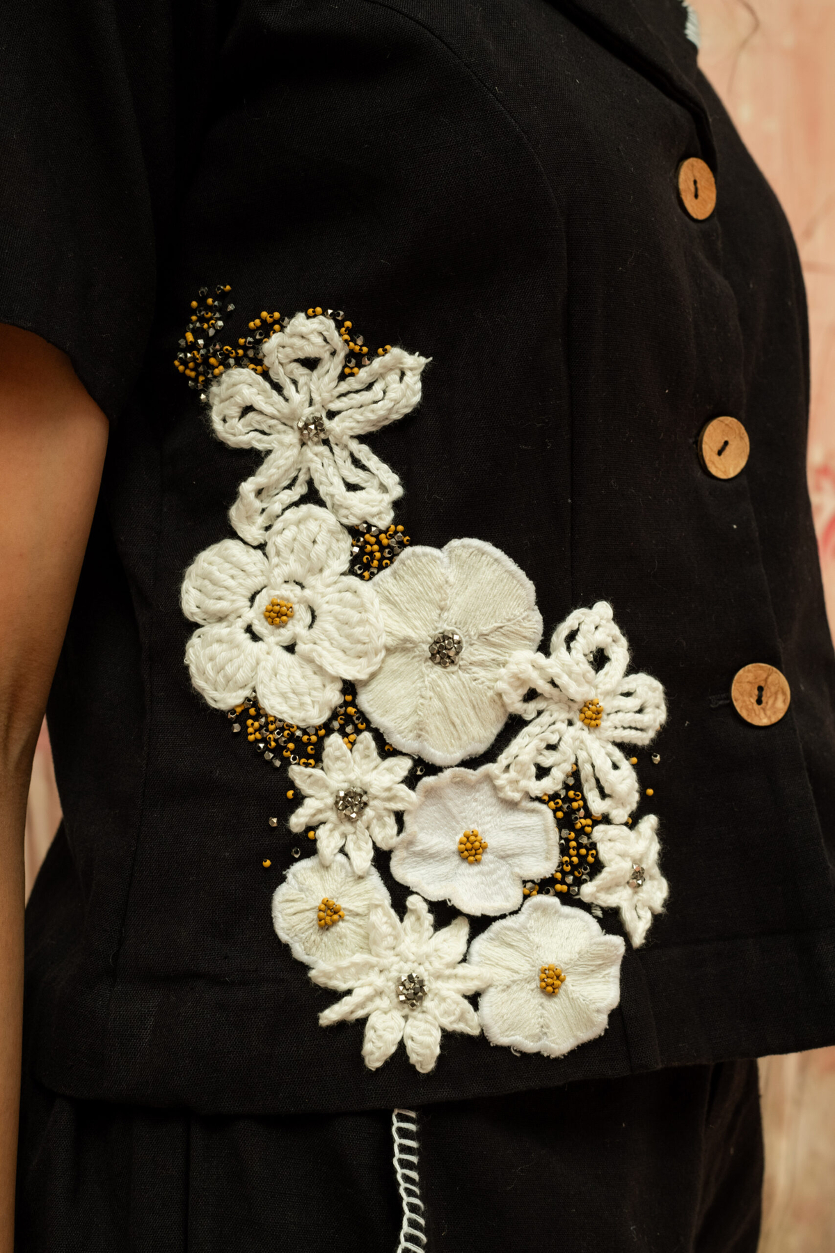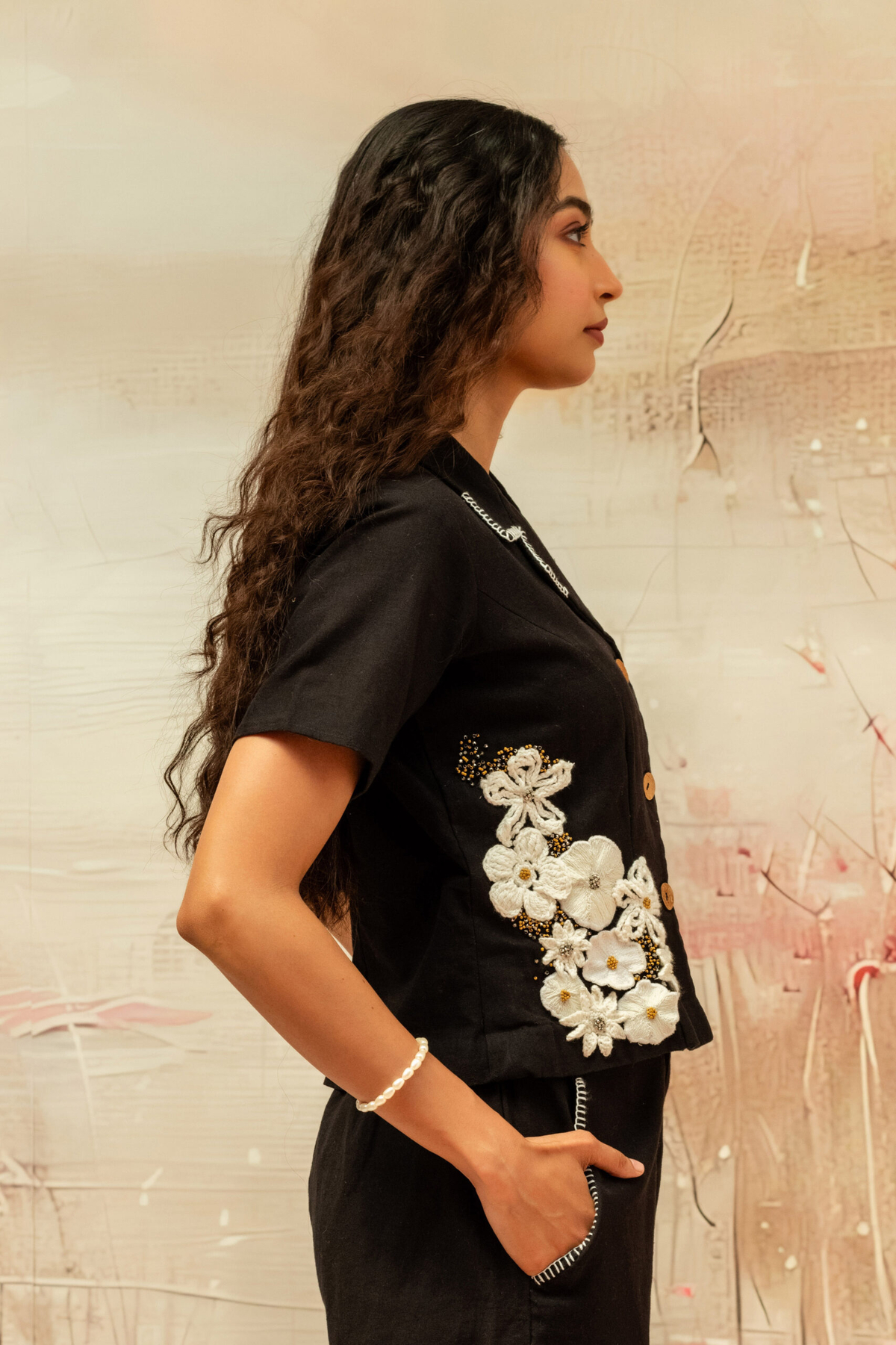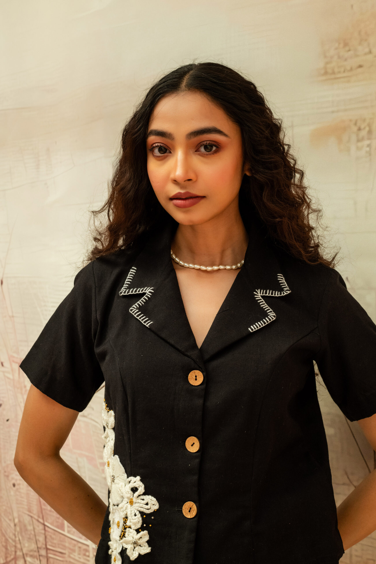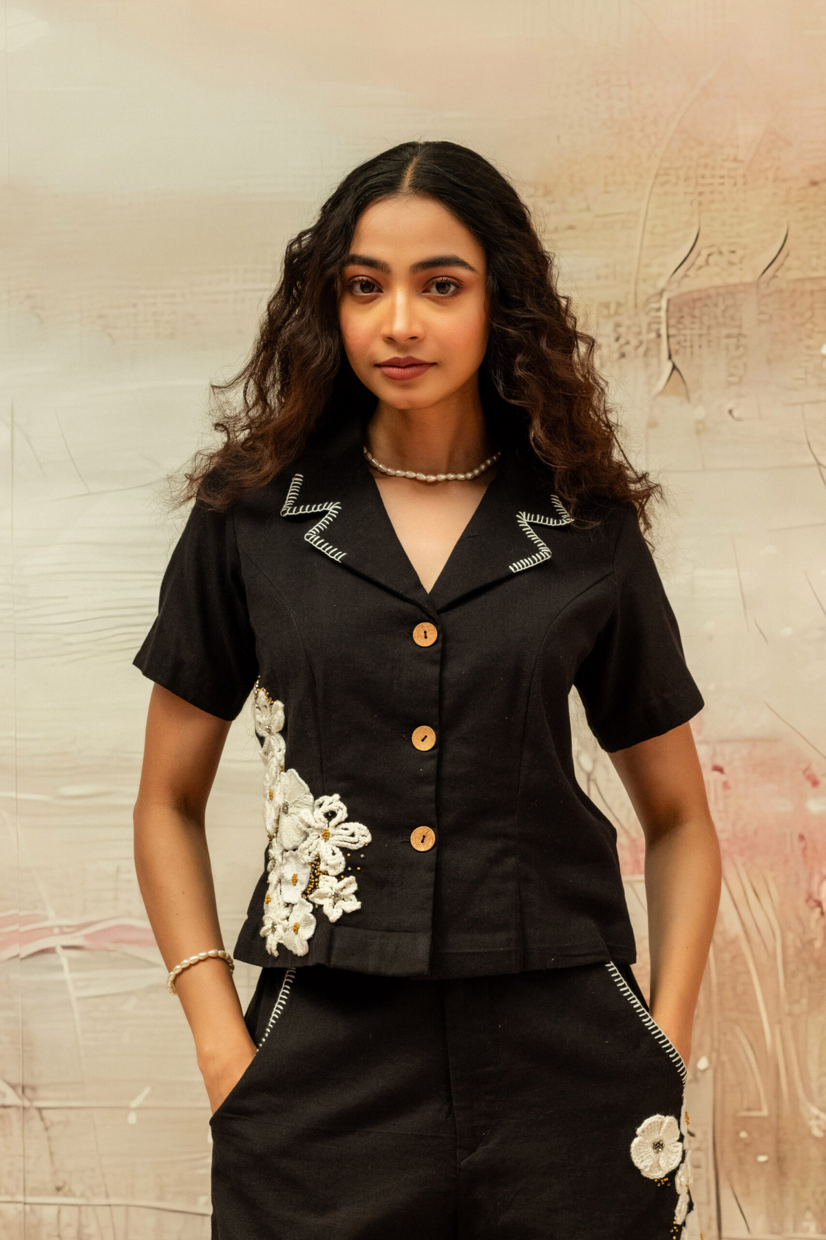 This relaxed, swing-style top features a soft gathered neckline with a side tie detail. Bold hand-embroidered motif patches add an artisanal touch to the breezy, asymmetric silhouette.